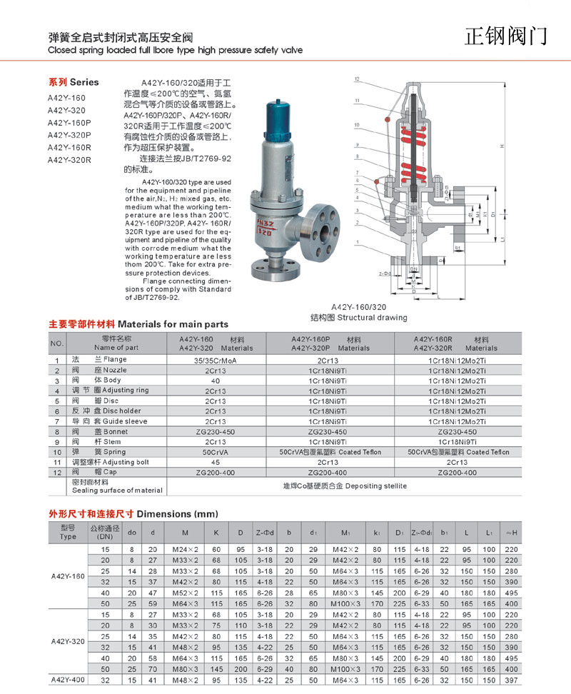 全啟式封閉高壓安全閥零部件材料及連接尺寸