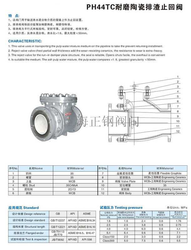 陶耐磨陶瓷排渣止回閥又稱陶瓷單向閥或陶瓷逆止閥,是指依靠介質本身流動而自動開、閉閥瓣,用來防止介質倒流的閥門。與普通金屬止回閥不同的是,陶瓷止回閥采用結構陶瓷做密封副,閥門與介質接觸部分材質均采用結構陶瓷材料,避免與介質直接接觸而產生腐蝕的可能。