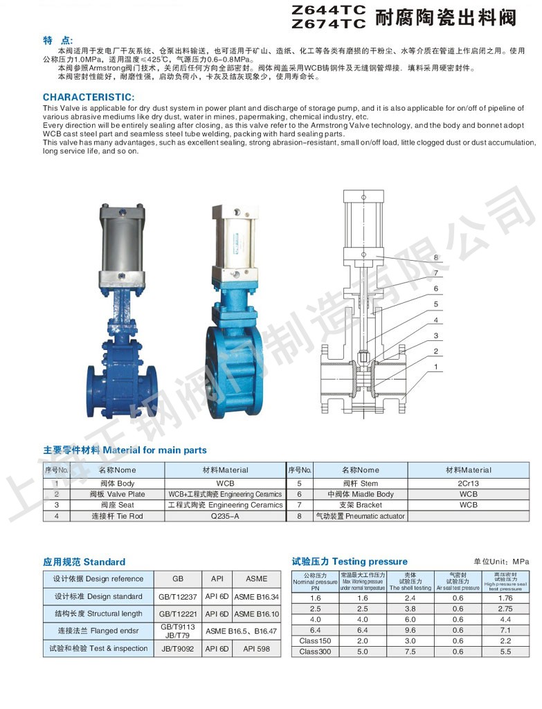 耐腐陶瓷出料閥適用于發(fā)電廠干灰系統(tǒng),倉泵出料輸送,也可適用于礦山,造紙,化工等各類有磨損的干粉塵,水等介質(zhì)在管道上作啟閉之用。適用公稱壓力1.0Mpa,適用溫度≤425℃,氣源壓力0.6-0.8Mpa。本閥門關(guān)閉后任何方向全密封,閥體閥蓋采用WCB鑄鋼件及無縫鋼管焊接。填料采用硬密封件。