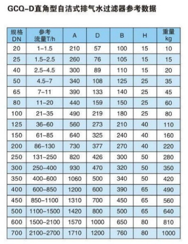 自潔式排氣水過濾器主要技術參數: