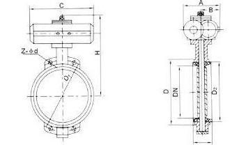 D671X氣動對夾式蝶閥采用新型系列GT型氣動執行器,有雙作用式和單作用式(彈簧復位),齒輪傳動,安全可靠;大口徑閥門采用系列AW型氣動執行器拔叉式傳動,結構合理,輸出扭矩大。
