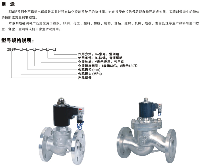 3、電磁閥按照功能分類:水用電磁閥、蒸汽電磁閥、制冷電磁閥、低溫電磁閥、燃氣電磁閥、消防電磁閥、氨用電磁閥、氣體電磁閥、液體電磁閥、微型電磁閥、脈沖電磁閥、液壓電磁閥 常開電磁閥、油用電磁閥、直流電磁閥、高壓電磁閥、防爆電磁閥等
