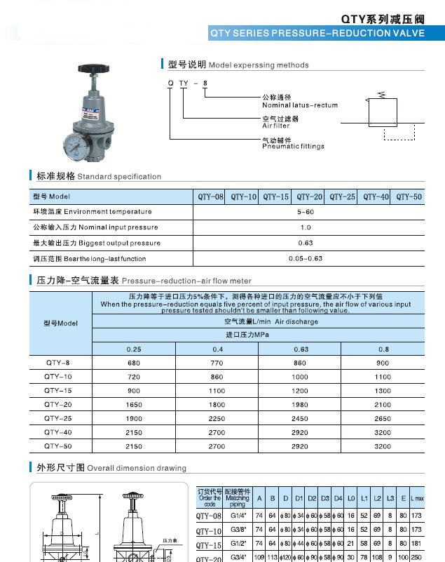 以QTY-15為例:Q表示氣動(dòng)元件,TY表示減壓閥,-15表示公稱通徑。