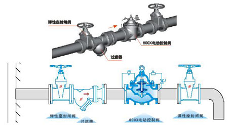 電動控制閥安裝在管路中。利用導向管上,遠距離控制的電磁閥啟閉來控制主閥的開啟與關閉。